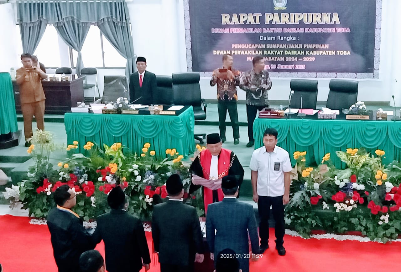 Pengucapan Sumpah Janji dipandu oleh Ketua Pengadilan Negeri Balige, Makmur Pakpahan. Usai pengucapan sumpah janji dan penandatanganan sumpah/janji, selanjutnya palu pimpinan DPRD diserahkan oleh Pimpinan sementara DPRD Kabupaten Toba kepada Ketua DPRD Kabupaten Toba defenitif.