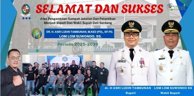 TLii | SUMUT | DELI SERDANG | Ikatan Wartawan Online (IWO) Deli Serdang mengucapkan selamat atas pelantikan dr. H. Asri Ludin Tambunan, MKed (PD), Sp.PD dan Lomlom Suwondo, SS sebagai Bupati dan Wakil Bupati Deli Serdang periode 2025-2030. Pelantikan tersebut berlangsung serentak bersama kepala daerah lainnya dan dipimpin langsung oleh Presiden Prabowo Subianto di Istana Kepresidenan, Jakarta, pada Kamis (20/2/2025).