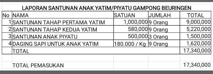 Kegiatan yang berlangsung di dalam komplek meunasah Beuringen ini dihadiri PJ Keuchik Beuringen Fauzan Azima dan ketua pemuda fakrurradhi tokoh masyarakat, karang taruna dan panitia pelaksana, serta para penerima santunan. Memberikan bantuan tahap pertama kepada anak yatim dan piyatu dilakukan pada tanggal 20 Maret berupa uang tunai untuk anak yatim dengan jumlah Rp 1.000.000 per jiwa dengan jumlah 9 jiwa anak yatim dan piyatu dengan jumlah Rp 500.000 per jiwa dengan jumlah penerima 3 Jiwa serta tahap kedua diberikan pada tanggal 29 maret hanya diberikan kepada anak yatim berupa uang tunai Rp 580.000 serta 1 kg daging sapi untuk setiap jiwa anak yatim , acara ini juga menjadi momen untuk mempererat tali silaturahmi antara warga dan anak-anak yatim. Sumber dana terkumpul dari masyarakat Beuringen yang menetap di kampung dan yang tinggal diluar daerah