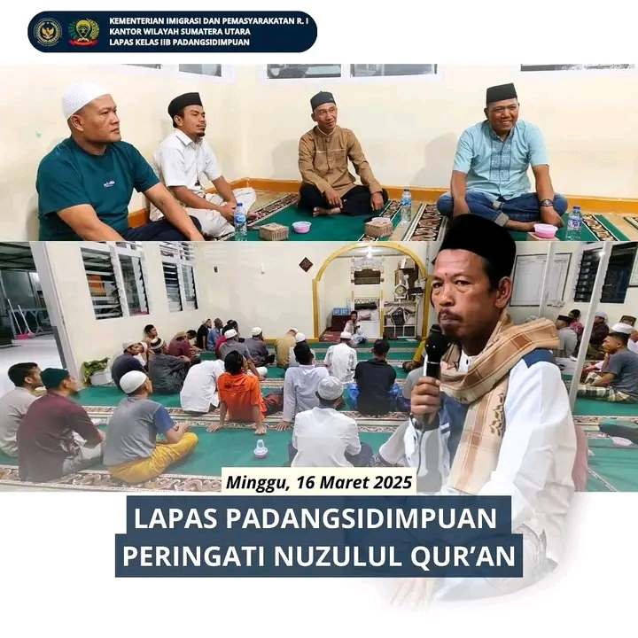 TIMELINES INEWS INVESTIGASI, Lapas Padangsidimpuan Lembaga Pemasyarakatan (Lapas) Kelas IIB Padangsidimpuan Kanwil Direktorat Jenderal Pemasyarakatan Sumater Utara memperingati Nuzulul Qur’an atau turunnya Al-Qur’an pada 21 Ramadhan 1446 H / 16 Maret 2025. Hal ini dilakukan dengan tujuan untuk memantapkan kecintaan warga binaan maupun pegawai terhadap kitab umat islam yaitu Al-Qur’an, Minggu (16/03/2025).