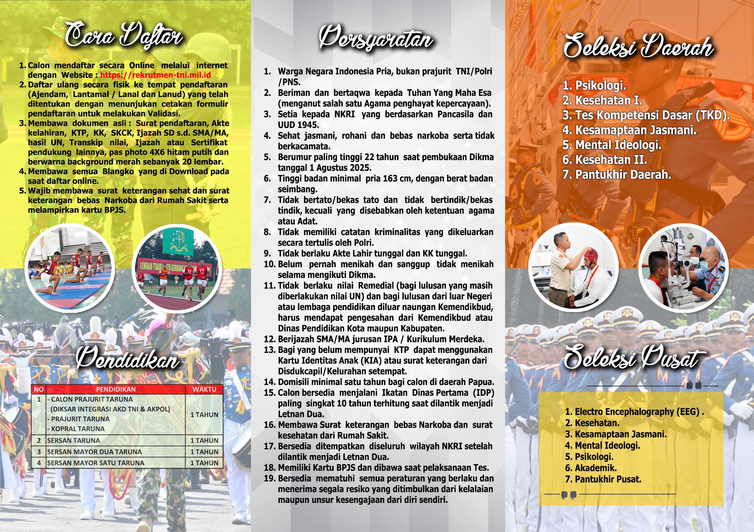 TIMELINES INEWS INVESTIGASI Banda Aceh – Kodam Iskandar Muda kembali membuka pendaftaran bagi calon Taruna Akademi Tentara Nasional Indonesia (TNI) tahun 2025. Pendaftaran berlangsung mulai 3 Maret hingga 17 April 2025. Program ini diperuntukkan bagi lulusan SMA/MA dengan usia maksimal 22 tahun. Jika lolos seleksi, para taruna akan menjalani pendidikan selama empat tahun dan dilatih untuk menjadi perwira TNI.