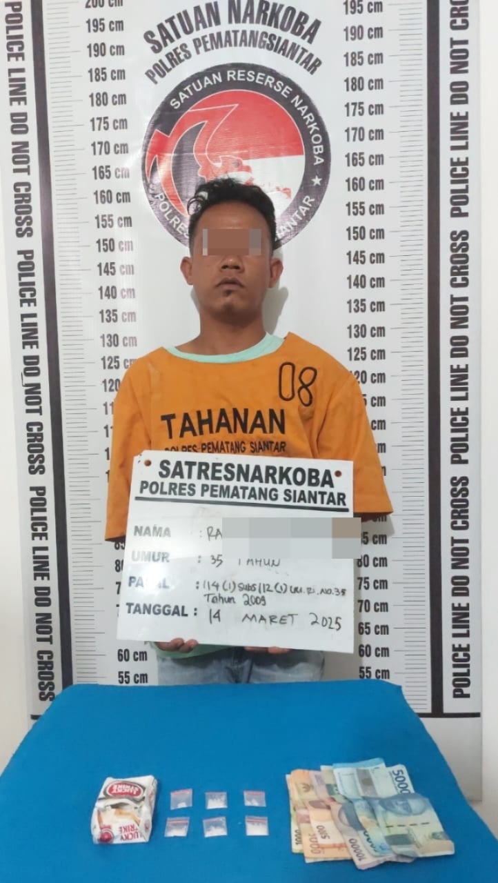 Satuan Reserse Narkoba Polres Pematangsiantar menangkap seorang pengedar narkoba jenis sabu di Jalan Bah Tongguran Kanan Kelurahan Sigulang gulang Kecamatan Sianțar Utara Kota Pematangsianțar pada hari Jumat 14 Maret 2025 sore pukul 17.45 Wib.