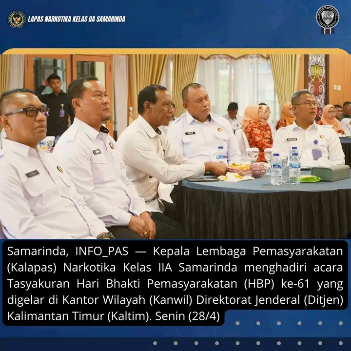 TIMELINES INEWS INVESTIGASI Samarinda, Kepala Lembaga Pemasyarakatan (Kalapas) Narkotika Kelas IIA Samarinda menghadiri acara Tasyakuran Hari Bhakti Pemasyarakatan (HBP) ke-61 yang digelar di Kantor Wilayah (Kanwil) Direktorat Jenderal (Ditjen) Kalimantan Timur (Kaltim). Senin (28/4)