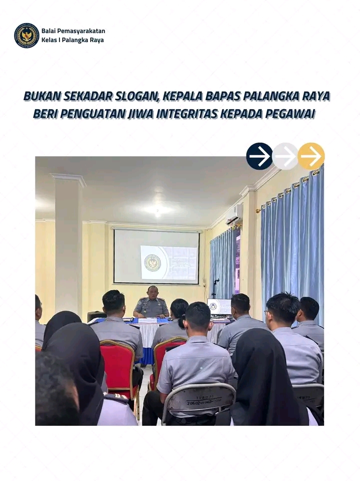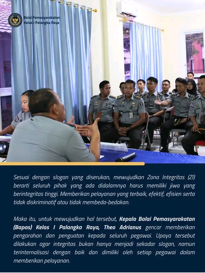 TIMELINES INEWS INVESTIGASI Palangka raya Dalam upaya mewujudkan Zona Integritas (ZI) menuju Wilayah Bebas dari Korupsi (WBK), Balai Pemasyarakatan (Bapas) Kelas I Palangka Raya terus menggencarkan penguatan nilai-nilai integritas kepada seluruh jajaran pegawai. Kepala Bapas Kelas I Palangka Raya, Theo Adrianus, menegaskan bahwa seluruh pihak harus memiliki jiwa berintegritas tinggi dalam memberikan pelayanan terbaik yang efektif, efisien, dan tidak diskriminatif.