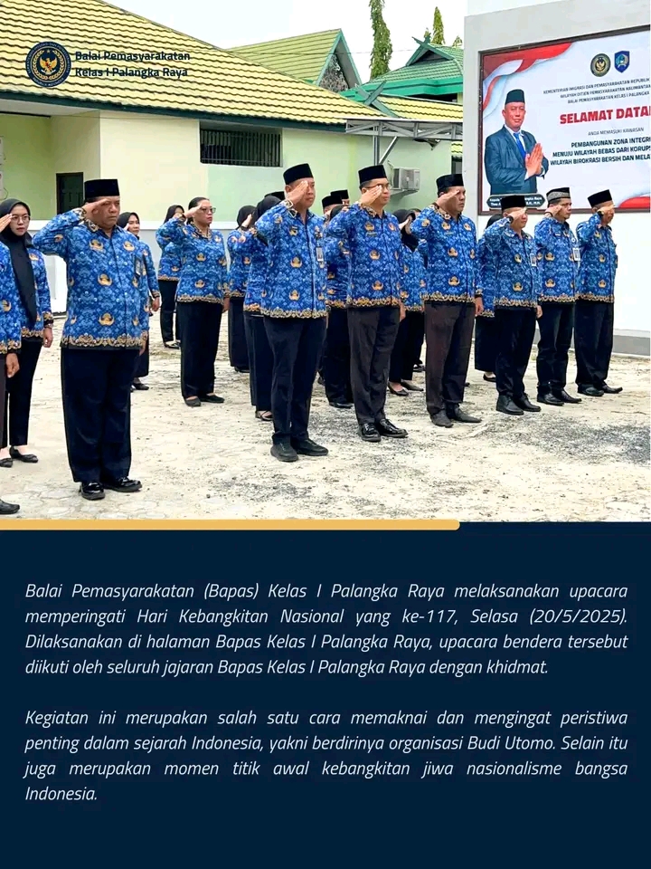 TIMELINES INEWS INVESTIGASI Palangka Raya 20 Mei 2025 Balai Pemasyarakatan (Bapas) Kelas I Palangka Raya melaksanakan upacara bendera dalam rangka memperingati Hari Kebangkitan Nasional (Harkitnas) ke-117 pada Selasa (20/5/2025). Bertempat di halaman Bapas, kegiatan ini diikuti secara khidmat oleh seluruh jajaran pegawai Bapas Kelas I Palangka Raya.