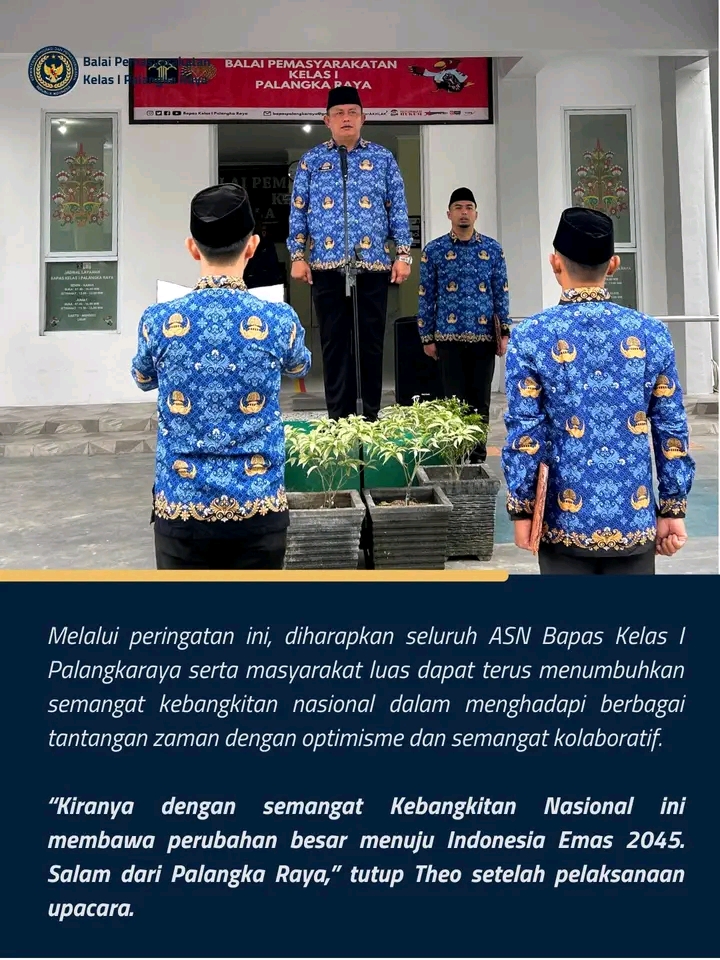 Kepala Bapas Kelas I Palangka Raya, Theo Adrianus, bertindak sebagai pembina upacara dan membacakan amanat Menteri Komunikasi dan Digital, Meutia Viada Hafid. Dalam amanat tersebut disampaikan bahwa Hari Kebangkitan Nasional merupakan momentum penting untuk mengenang perjuangan dan semangat kebangsaan yang lahir dari berdirinya organisasi Budi Utomo pada 20 Mei 1908 dan peristiwa Sumpah Pemuda tahun 1928.