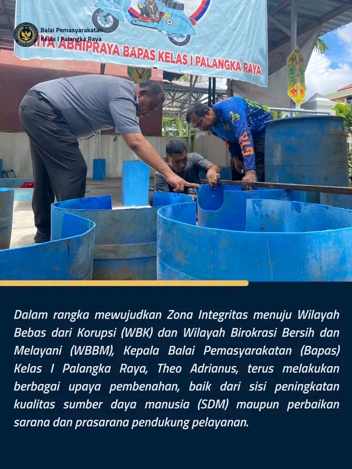 TIMELINES INEWS INVESTIGASI Palangka Raya, 20 Mei 2025 Dalam rangka mewujudkan Zona Integritas menuju Wilayah Bebas dari Korupsi (WBK) dan Wilayah Birokrasi Bersih dan Melayani (WBBM), Balai Pemasyarakatan (Bapas) Kelas I Palangka Raya terus melakukan berbagai langkah pembenahan. Kepala Bapas Kelas I Palangka Raya, Theo Adrianus, memimpin langsung upaya peningkatan kualitas layanan dengan fokus pada penguatan sumber daya manusia (SDM) dan perbaikan sarana-prasarana pelayanan publik.