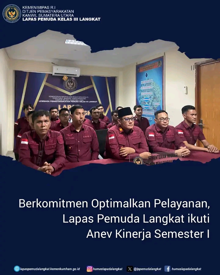 TIMELINES INEWS INVESTIGASI Langkat Lembaga Pemasyarakatan Pemuda Kelas III Langkat menghadiri rapat analisa dan evaluasi kinerja pemasyarakatan Semester I Tahun 2025 secara virtual, Kamis (15/05/2025). Rapat ini dipimpin langsung oleh Direktur Permasyarakatan, Brigjen Pol. Drs. Mashudi, dan diikuti oleh seluruh kepala kantor wilayah Direktorat Jenderal Pemasyarakatan (Ditjenpas) dari seluruh Indonesia.