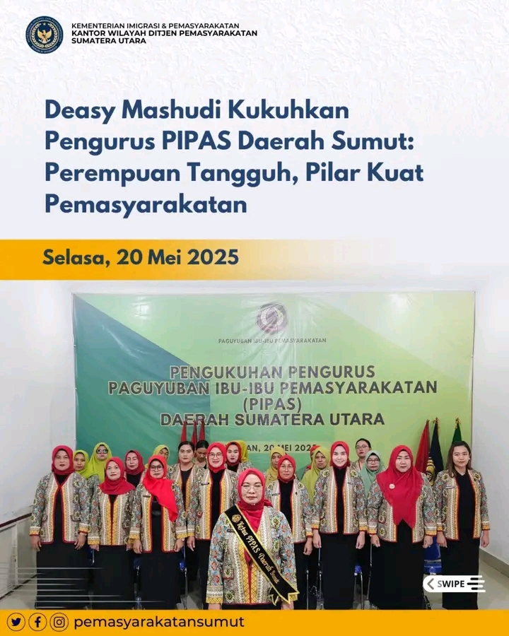 TIMELINES INEWS INVESTIGASI Medan Semangat kebersamaan dan pengabdian kembali digaungkan dalam tubuh Peguyuban Ibu-Ibu Pemasyarakatan (PIPAS). Ketua Umum PIPAS, Ny. Deasy Mashudi, secara resmi mengukuhkan jajaran pengurus PIPAS seluruh Indonesia, termasuk Ketua PIPAS Daerah Sumatera Utara, Ny. Fitri Yani Suseno, dalam sebuah acara virtual yang berlangsung serentak pada Selasa (20/5/25)