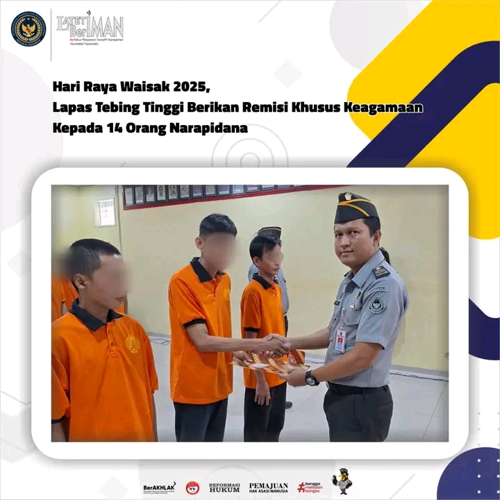 TIMELINES INEWS INVESTIGASI, Tebing Tinggi Momentum Hari Raya selalu ditunggu-tunggu oleh setiap umat agama, tak terkecuali para warga binaan pemasyarakatan yang sedang menjalani masa pidana. Kementerian Imigrasi dan Pemasyarakatan melalui Lembaga Pemasyarakatan (Lapas) Kelas IIB Tebing Tinggi menggelar acara pemberian Remisi Khusus Waisak Tahun 2025 untuk narapidana berkeyakinan Buddha.
