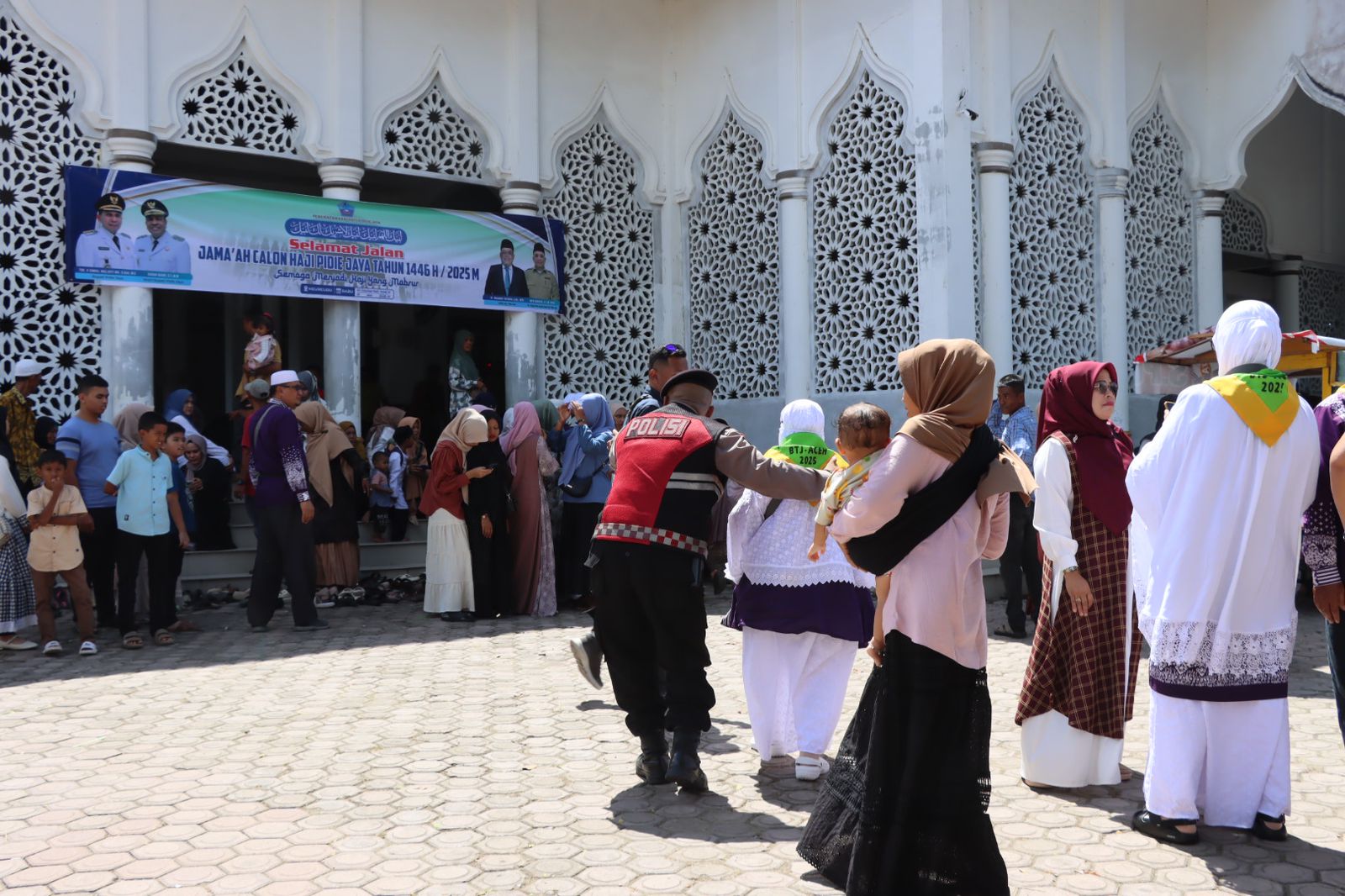 Pelepasan yang dimulai pukul 16.00 WIB ini mendapat perhatian serius dari Polres Pidie Jaya. Sejak pukul 12.00 WIB, puluhan personel telah diterjunkan untuk melakukan pengamanan menyeluruh, baik di lokasi keberangkatan maupun sepanjang rute menuju titik pemberangkatan ke Asrama Haji Banda Aceh.