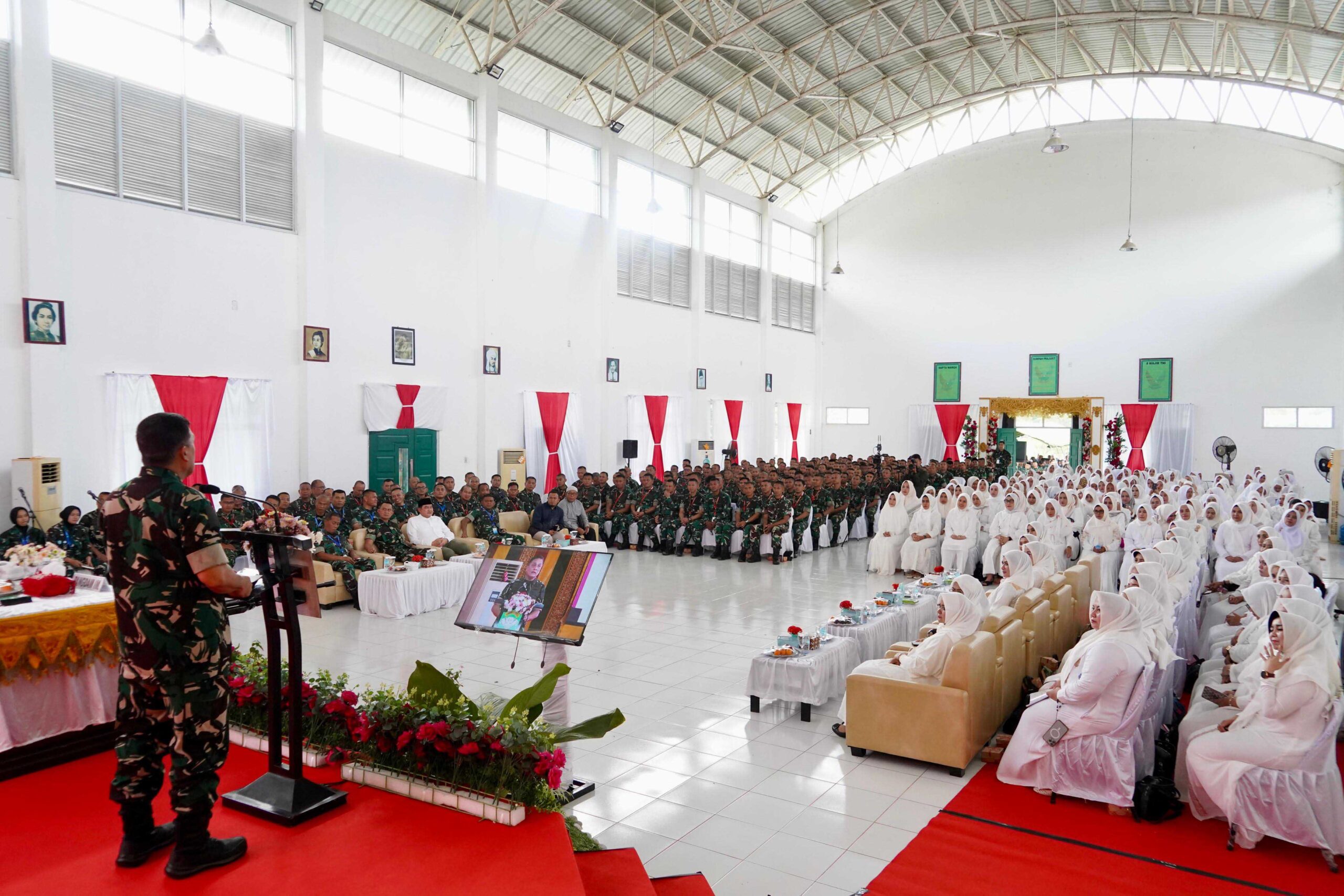 Mayor Jenderal TNI Niko Fahrizal, M.Tr.(Han), didampingi Ketua Persit Kartika Chandra Kirana Daerah Iskandar Muda, Ny. Eva Niko Fahrizal, menghadiri kegiatan ceramah keagamaan dilaksanakan di Aula Markas Yonif 116/Garda Samudera, Meulaboh, Aceh Barat, Kamis (15/5/2025).