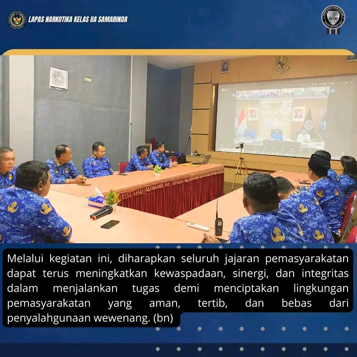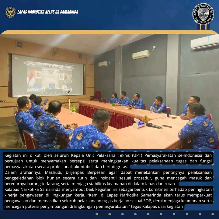 TIMELINES INEWS INVESTIGASI Samarinda, Kepala Lembaga Pemasyarakatan (Lapas) Narkotika Kelas IIA Samarinda mengikuti kegiatan Zoom Meeting yang diselenggarakan oleh Direktorat Jenderal Pemasyarakatan dalam rangka penguatan pengawasan internal, khususnya terkait pelaksanaan penggeledahan blok hunian dan antisipasi risiko penyimpangan prosedur serta potensi gangguan keamanan dan ketertiban (kamtib), Selasa (20/5/25)