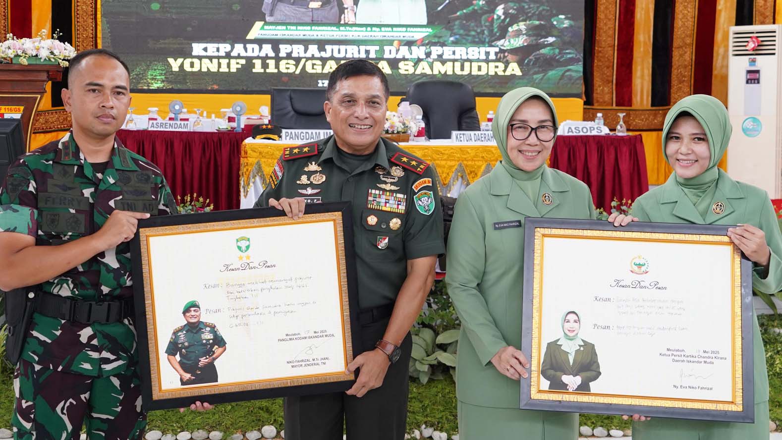 Di akhir kegiatan, Pangdam IM dan Ketua Persit KCK Daerah IM menerima cendera mata dari satuan Yonif 116/GS, menuliskan pesan dan kesan, serta mengikuti sesi foto bersama seluruh prajurit dan anggota Persit sebagai penutup rangkaian kunjungan kerja.