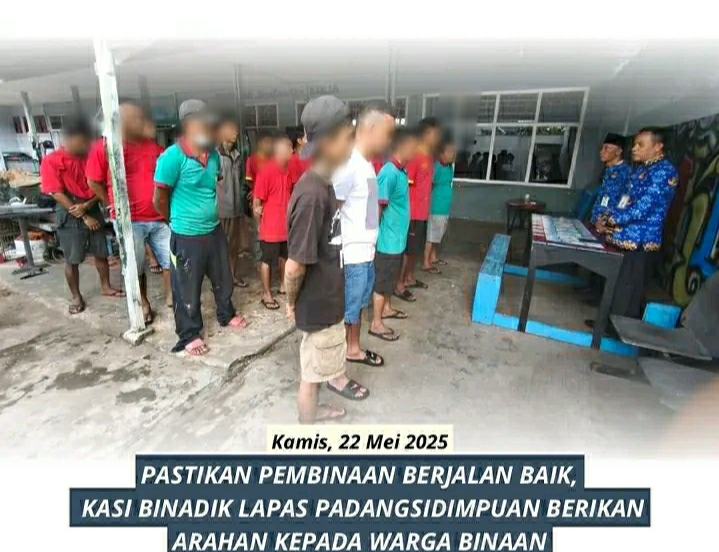 Dalam rangka melakukan pemninaan berkelanjutan yang aman dan tertib, Erikjen Silalahi yang merupakan Kasi Binadik Lapas Kelas IIB Padanhsidimpuan memberikan arahan dan nasehat kepada warga binaan agar mengikuti program pimbinaan dengan baik, Kamis, 22 Mei 2025.