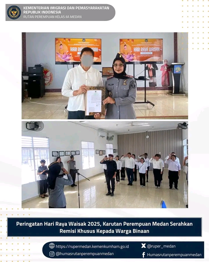 TIMELINES INEWS INVESTIGASI Medan Dalam rangka memperingati Hari Raya Waisak 2569 BE / 2024 Masehi, Rutan Perempuan Kelas II A Medan mengadakan penyerahan remisi khusus kepada warga binaan, Senin (12/05/2025). Kepala Rutan Perempuan Kelas IIA Medan, Marlia Rezeki Santoso, menyerahkan remisi secara langsung kepada para warga binaan yang berhak. Hadir dalam acara ini Pejabat Struktural beserta pegawai yang bertugas.