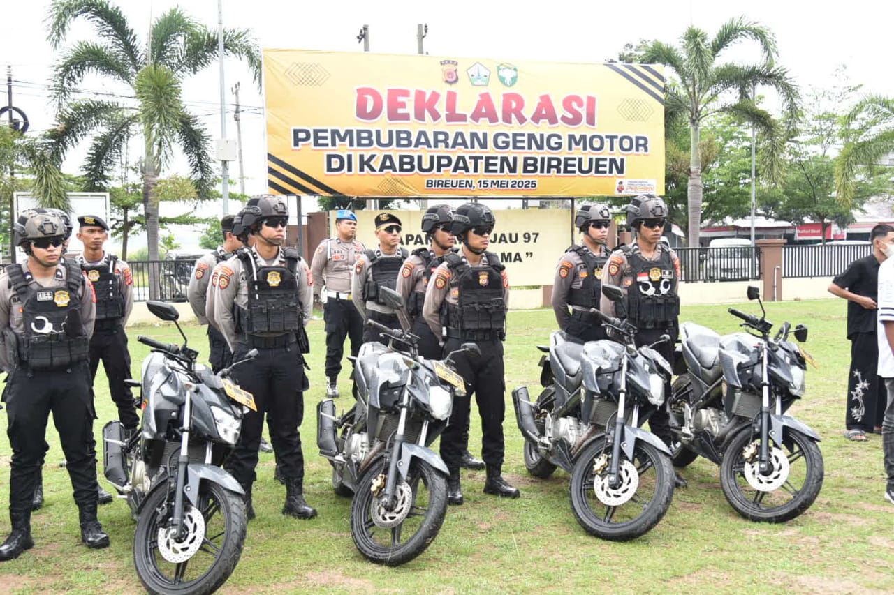 TLII>>Bireuen — Polres Bireuen menggelar deklarasi pembubaran geng motor yang menamakan diri sebagai Pasukan Jalan Sadis (PJS), dalam sebuah kegiatan yang berlangsung di Lapangan Hijau 97 “Wira Pratama”, Mapolres Bireuen, Kamis, 15 Mei 2025.