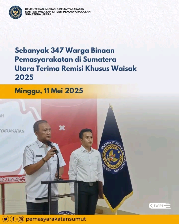 TIMELINES INEWS INVESTIGASI Medan, 11 Mei 2025 Sebanyak 347 warga binaan Pemasyarakatan (WBP) di wilayah Sumatera Utara menerima Remisi Khusus (RK) Hari Raya Waisak tahun 2025. Remisi ini diberikan sebagai bentuk penghargaan negara kepada narapidana yang telah menunjukkan perubahan perilaku positif dan memenuhi syarat administratif maupun substantif.