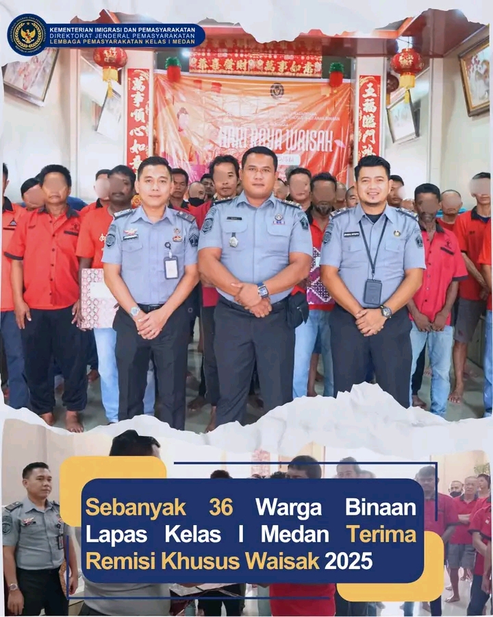 TIMELINES INEWS INVESTIGASI Medan, Lapas Kelas I Medan melaksanakan kegiatan penyerahan Remisi Khusus (RK) Waisak Tahun 2025 kepada 36 orang warga binaan pemasyarakatan (WBP). Kegiatan ini digelar di Vihara Buddha Sasana yang berada di dalam lingkungan Lapas, dan berlangsung dengan khidmat pada Senin pagi, 12 Mei 2025. Penyerahan remisi ini merupakan bentuk penghargaan negara kepada warga binaan yang beragama Buddha dan telah menunjukkan sikap positif serta berperilaku baik selama menjalani masa pidana.