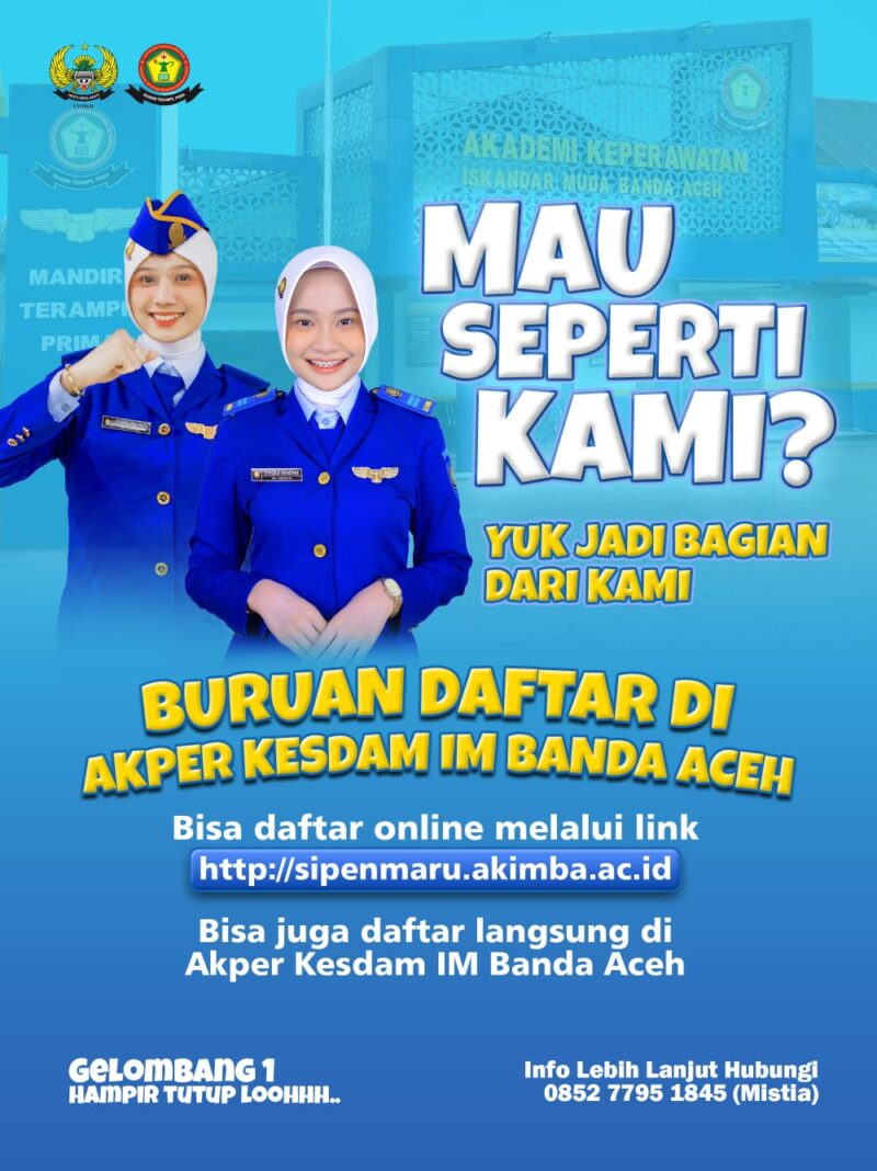 TIMELINES INEWS INVESTIGASI Banda Aceh – Akademi Keperawatan (Akper) Kesdam Iskandar Muda Banda Aceh secara resmi membuka Penerimaan Mahasiswa Baru (PMB) untuk Tahun Akademik 2025/2026. Proses seleksi akan dilaksanakan dalam tiga gelombang, dengan jumlah kuota terbatas pada masing-masing gelombang. Pendaftaran telah dibuka sejak awal Januari lalu dan akan berlangsung hingga akhir Juli mendatang, sebagaimana diumumkan pada Selasa (3/6/2025).