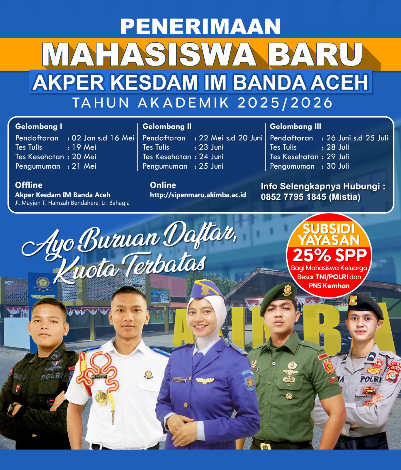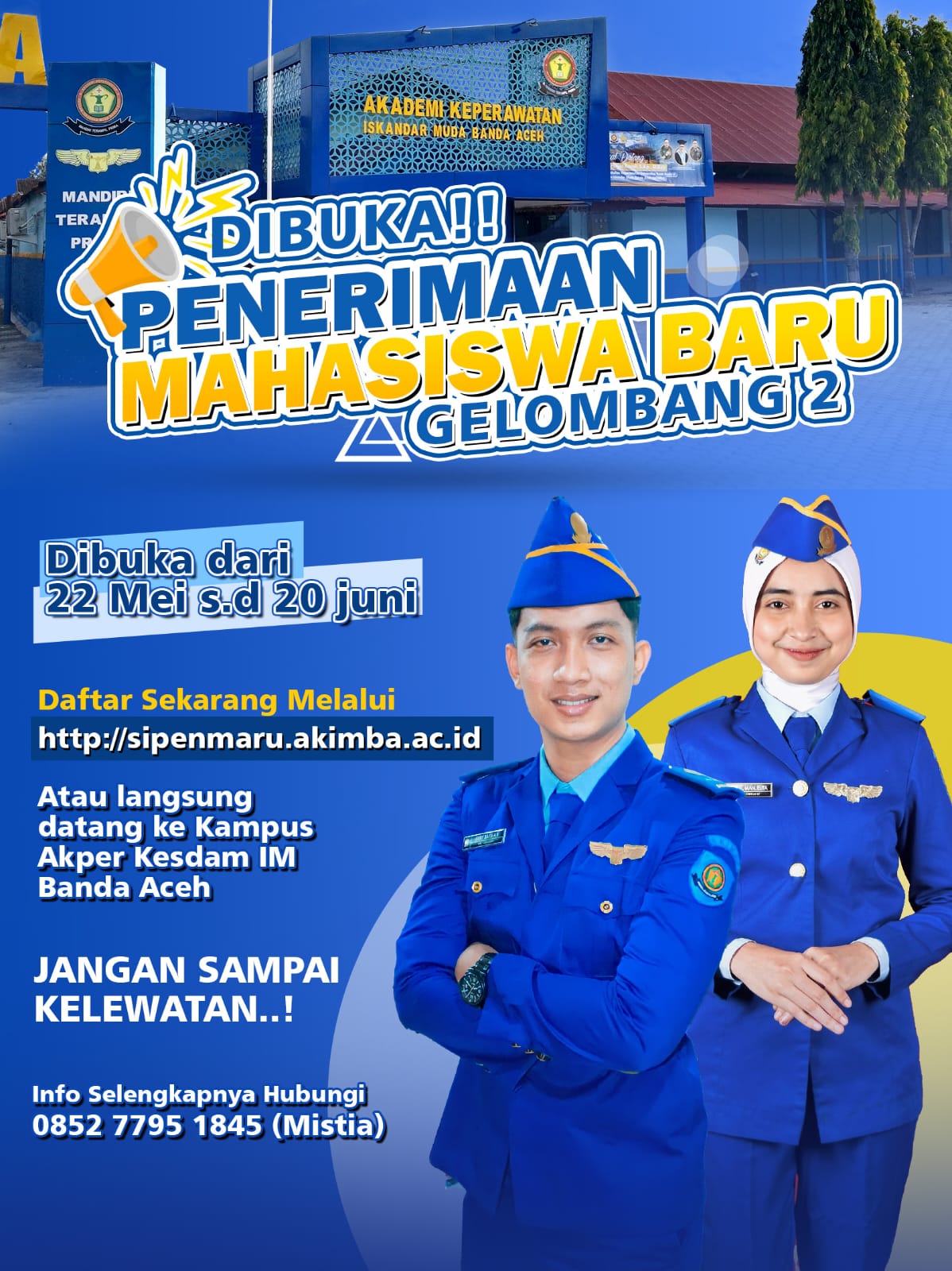 Pihak Akper mengimbau kepada para calon mahasiswa untuk segera mendaftarkan diri tanpa menunda, mengingat kuota penerimaan terbatas di setiap gelombang. Pendaftaran dapat dilakukan secara online melalui laman resmi https://sipenmaru.akimba.ac.id atau secara langsung dengan mengunjungi Kampus Akper Kesdam IM yang beralamat di Jalan Mayjen T. Hamzah Bendahara, Lorong Bahagian, Kecamatan Kuta Alam, Kota Banda Aceh.
