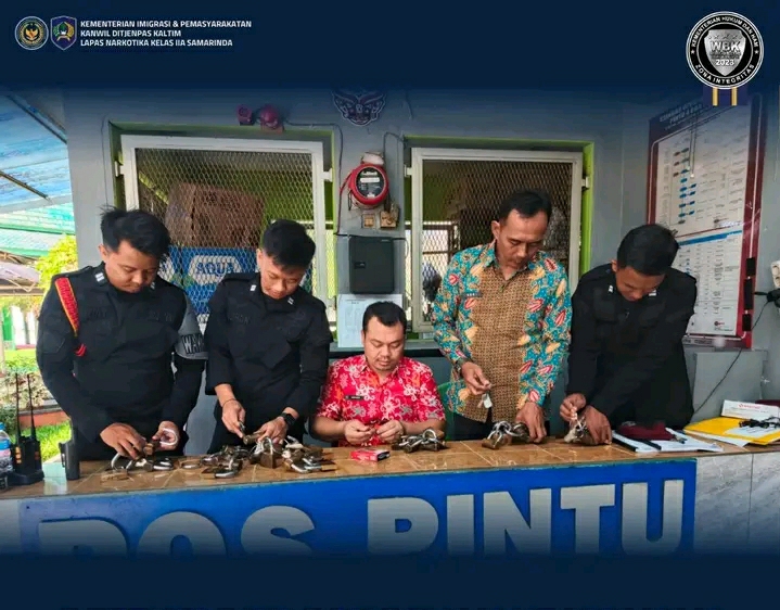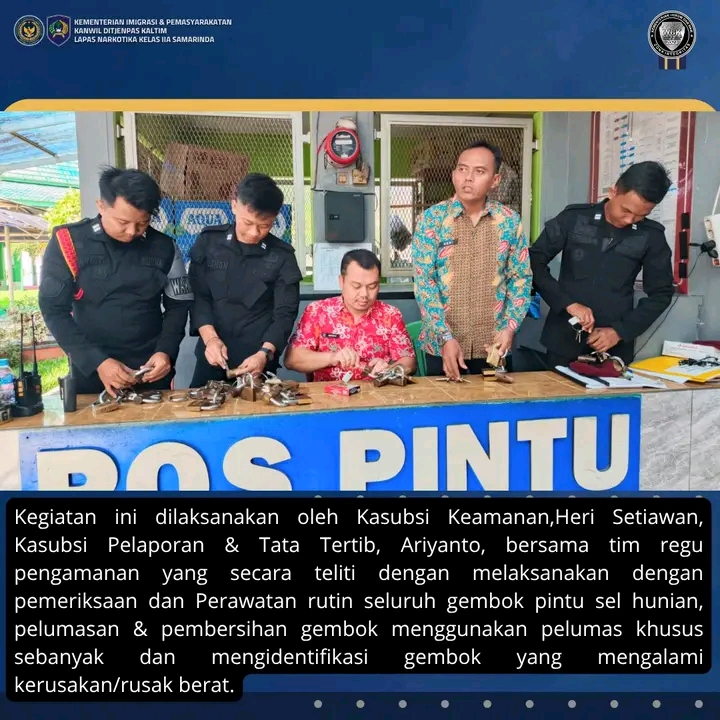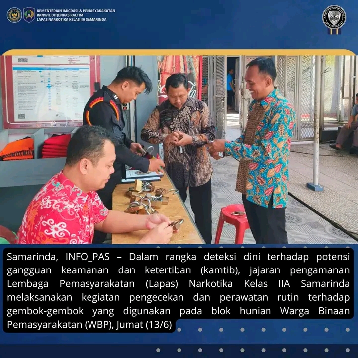 Samarinda, Dalam rangka deteksi dini terhadap potensi gangguan keamanan dan ketertiban (kamtib), jajaran pengamanan Lembaga Pemasyarakatan (Lapas) Narkotika Kelas IIA Samarinda melaksanakan kegiatan pengecekan dan perawatan rutin terhadap gembok-gembok yang digunakan pada blok hunian Warga Binaan Pemasyarakatan (WBP), Jumat (13/6)