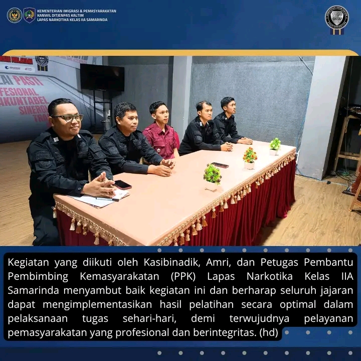 Kegiatan yang diikuti oleh Kasibinadik, Amri, dan Petugas Pembantu Pembimbing Kemasyarakatan (PPK) Lapas Narkotika Kelas IIA Samarinda menyambut baik kegiatan ini dan berharap seluruh jajaran dapat mengimplementasikan hasil pelatihan secara optimal dalam pelaksanaan tugas sehari-hari, demi terwujudnya pelayanan pemasyarakatan yang profesionalitas dan berintegritas, Tutupnya.