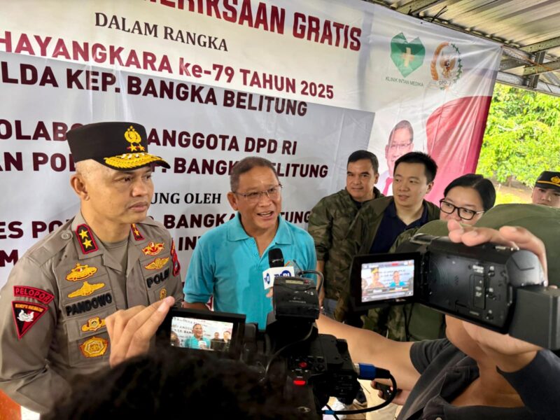 Anggota DPD/MPR RI Dr (C) Bahar Buasan,S.T.,M.S.M.,M.S.C kolaborasi Bersama Polda Provinsi Bangka Belitung melaksanakan kegiatan pelayanan kesehatan gratis bagi masyarakat dalam memperingati HUT Bhayangkara ke-79 sebagai bentuk kepedulian terhadap kesehatan warga.