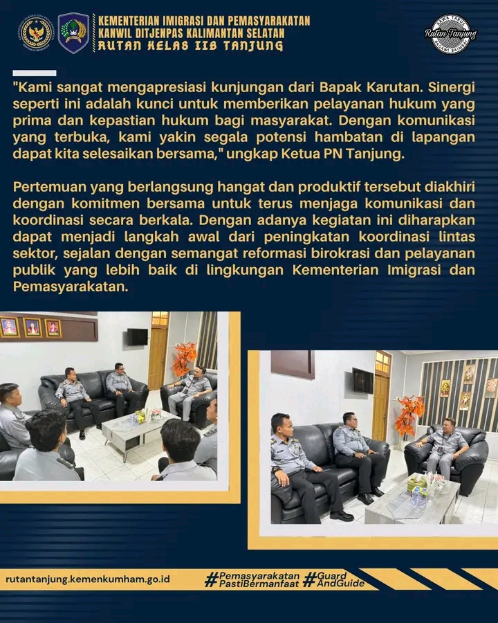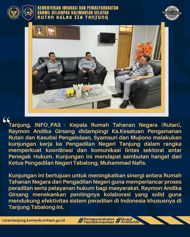 TIMELINES INEWS INVESTIGASI, Tanjung, Kepala Rumah Tahanan Negara (Rutan), Raymon Andika Girsang didampingi Ka.Kesatuan Pengamanan Rutan dan Kasubsi Pengelolaan, Syamsuri dan Mujiono melakukan kunjungan kerja ke Pengadilan Negeri Tanjung dalam rangka memperkuat koordinasi dan komunikasi lintas sektoral antar Penegak Hukum. Kunjungan ini mendapat sambutan hangat dari Ketua Pengadilan Negeri Tabalong, Muhammad Nafis.
