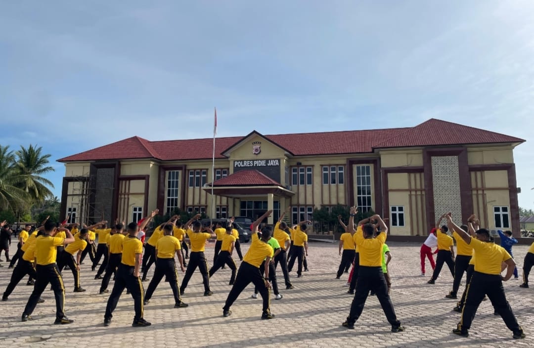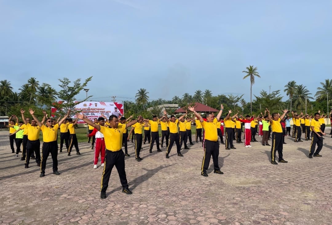 Senam massal yang mengusung tema “Polri Untuk Masyarakat Sehat Bersama Kapolres Pidie Jaya” ini dipimpin langsung oleh Kapolres Pidie Jaya, AKBP Ahmad Faisal Pasaribu, S.H., S.I.K., M.H., dan turut dihadiri oleh Wakapolres Kompol Iswahyudi, Kabag Ops Kompol Teuku Muhammad, serta AKP Mahyuddin selaku koordinator pelaksana.