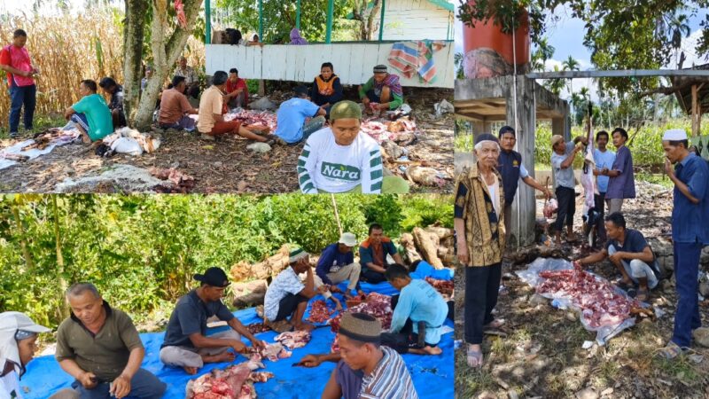 TLii | ACEH | Kutacane – Masyarakat Desa Sebudi Jaya, Kecamatan Bukit Tusam, Kabupaten Aceh Tenggara, menunjukkan antusiasme tinggi dalam pelaksanaan penyembelihan hewan kurban dalam rangka Hari Raya Idul Adha 1446 Hijriah yang digelar di lingkungan Pesantren Serambi Aceh, Jumat (6/6/2025).