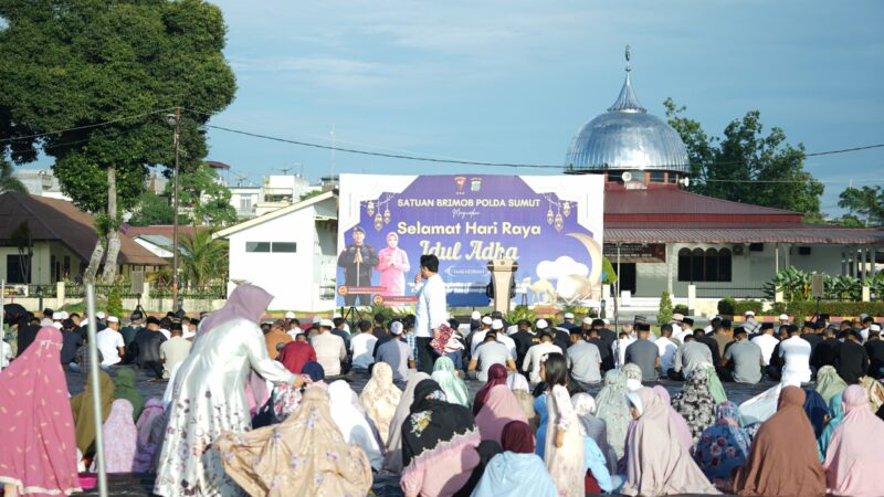 TLii|SUMUT|Medan, 6 Juni 2025 — Suasana khidmat dan penuh kebersamaan mewarnai pelaksanaan Shalat Idul Adha 1446 H yang digelar di Lapangan Hijau Ksatriaan K.E Lumi, Markas Komando Satuan Brimob Polda Sumatera Utara, Jumat pagi (06/06/2025). Ribuan jamaah dari kalangan masyarakat sekitar, personel Brimob, Bhayangkari, serta anak-anak memenuhi lapangan yang terletak di Jl. Bhayangkara No.293, Kelurahan Indra Kasih, Kecamatan Medan Tembung, Kota Medan.
