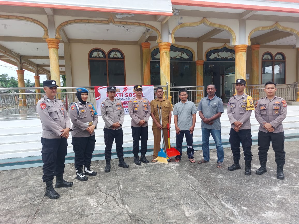 TLII>>Tapaktuan – Dalam rangka menyambut Hari Bhayangkara ke-79 Tahun 2025, Polsek Meukek Polres Aceh Selatan Polda Aceh melaksanakan kegiatan bakti sosial religi berupa bersih-bersih Mesjid Baitul Ichsan yang berlokasi di Gampong Lhok Aman, Kecamatan Meukek, Kabupaten Aceh Selatan, Kamis, 19 Juni 2025.