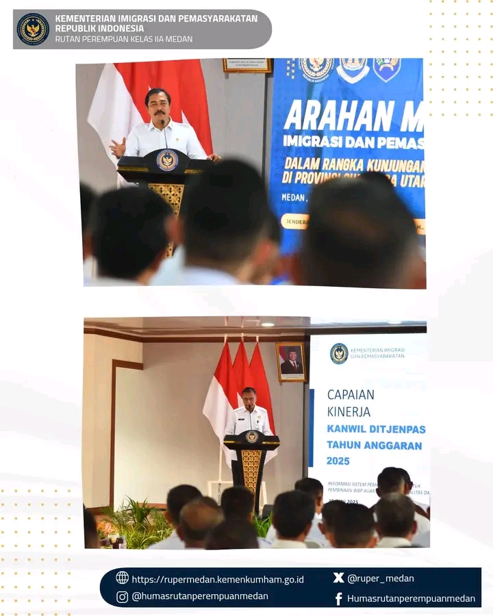 TIMELINES INEWS INVESTIGASI, Medan Menteri Imigrasi dan Pemasyarakatan Republik Indonesia, Agus Andrianto menyampaikan arahan serta penguatan kepada seluruh jajaran unit teknis Pemasyarakatan dan Imigrasi, Rabu (25/06). Kegiatan ini terlaksana usai makan siang bersama Warga Binaan serta peninjauan sejumlah kegiatan pembinaan di Lapas Kelas I Medan.