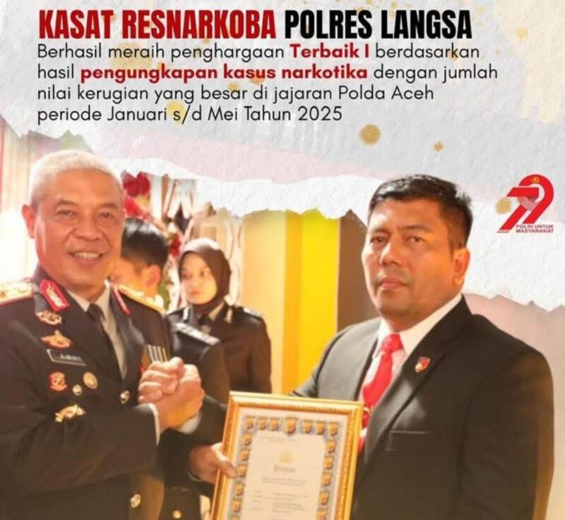 Kota Langsa – Dalam rangka peringatan Hari Bhayangkara ke-79 yang digelar di Meuligo Polda Aceh pada Selasa, 1 Juli 2025, Polres Langsa kembali mencatatkan prestasi membanggakan di tingkat Polda. Satuan Reserse Narkoba (Satresnarkoba) Polres Langsa dinobatkan sebagai Kasat Resnarkoba Terbaik I, berkat keberhasilannya mengungkap kasus narkotika dengan nilai kerugian besar sepanjang periode Januari hingga Mei 2025.