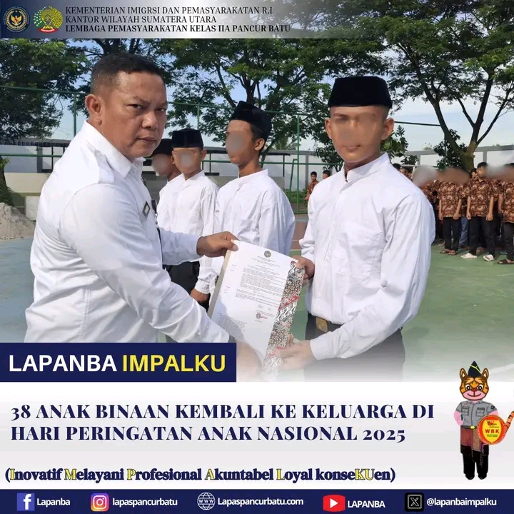 TIMELINES INEWS INVESTIGASI Jakarta, 23 Juli 2025 Dalam rangka memperingati Hari Anak Nasional (HAN) Tahun 2025, Kementerian Imigrasi dan Pemasyarakatan melalui Direktorat Jenderal Pemasyarakatan memberikan Pengurangan Masa Pidana (PMP) kepada 1.310 Anak Binaan di seluruh Indonesia. Dari jumlah tersebut, 38 Anak Binaan dinyatakan langsung bebas usai menerima PMP HAN II, sedangkan 1.272 Anak Binaan lainnya tetap melanjutkan pembinaan setelah mendapatkan PMP HAN I.