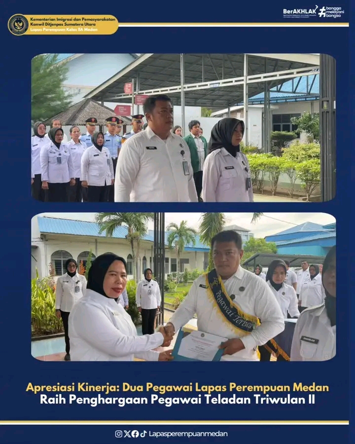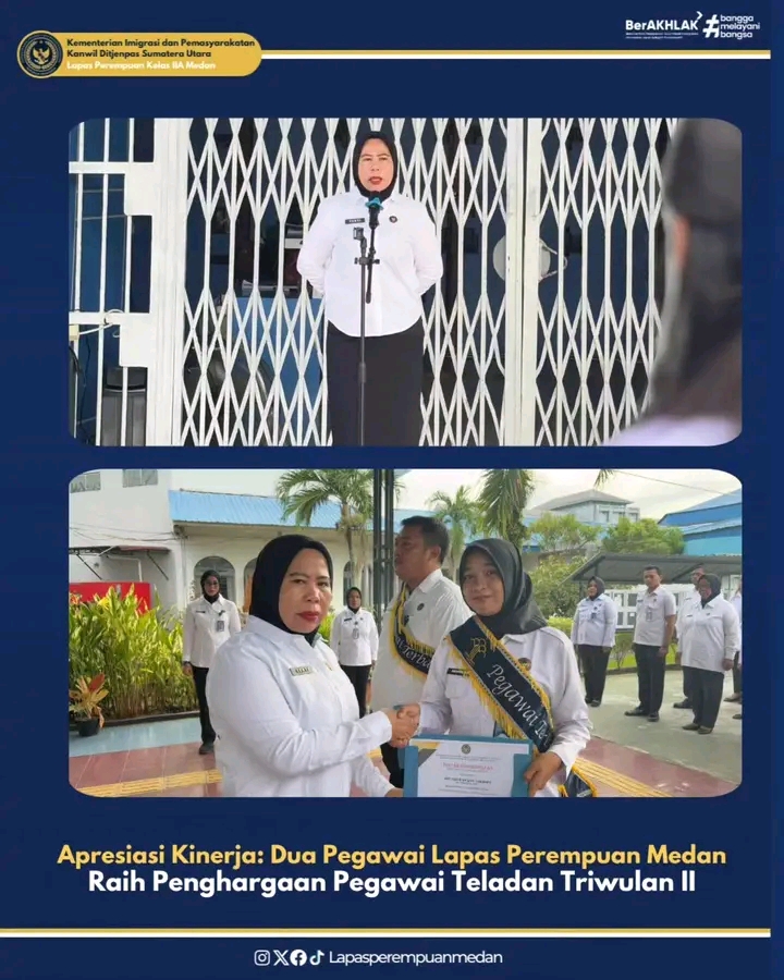 TIMELINES INEWS INVESTIGASI, Medan Lapas Perempuan Kelas IIA Medan kembali memberikan penghargaan kepada pegawai teladan sebagai bentuk penghargaan atas dedikasi dan integritas dalam bekerja. Penghargaan tersebut diberikan pada apel pagi, Senin (21/07/25)