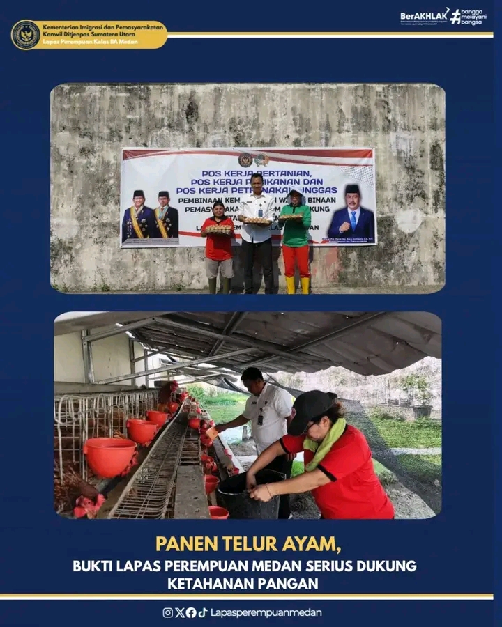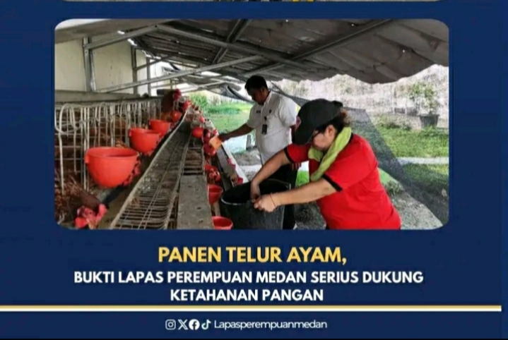 TIMELINES INEWS INVESTIGASI, Medan Lembaga Pemasyarakatan (Lapas) Perempuan Kelas IIA Medan menunjukkan komitmennya dalam mendukung program ketahanan pangan nasional melalui pelaksanaan panen perdana telur ayam pada Selasa (29/07/2025). Kegiatan ini juga menjadi bagian dari upaya pembinaan kemandirian bagi warga binaan pemasyarakatan (WBP) melalui sektor agribisnis.
