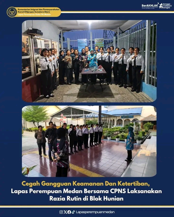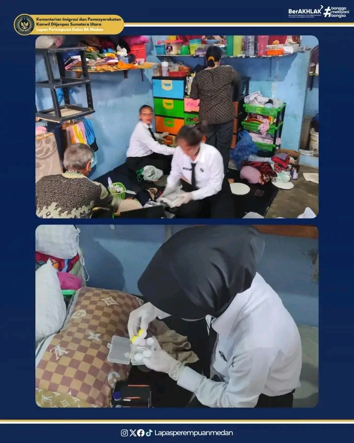 TIMELINES INEWS INVESTIGASI, Medan Lembaga Pemasyarakatan Perempuan Kelas IIA Medan kembali melaksanakan penggeledahan rutin di blok hunian sebagai langkah preventif menjaga keamanan dan ketertiban. Kegiatan ini dipimpin langsung oleh Kepala Kesatuan Pengamanan, Sepriana Putri dan Kepala Seksi Keamanan dan Ketertiban, Fice Paina bersama tim pengamanan dan Calon Pegawai Negeri Sipil (CPNS) Lapas Perempuan Medan, Sabtu (05/07).