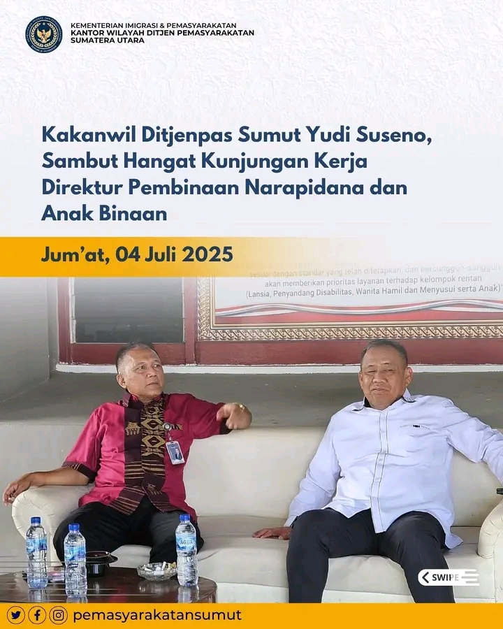 TIMELINES INEWS INVESTIGASI, Medan Kepala Kantor Wilayah Direktorat Jenderal Pemasyarakatan (Ditjenpas) Sumatera Utara, Yudi Suseno, menyambut hangat kunjungan kerja Bapak Yulius Sahruzah, Direktur Pembinaan Narapidana dan Anak Binaan Direktorat Jenderal Pemasyarakatan, Kementerian Imigrasi dan Pemasyarakatan (Kemenimipas), pada Jumat (04/07).
