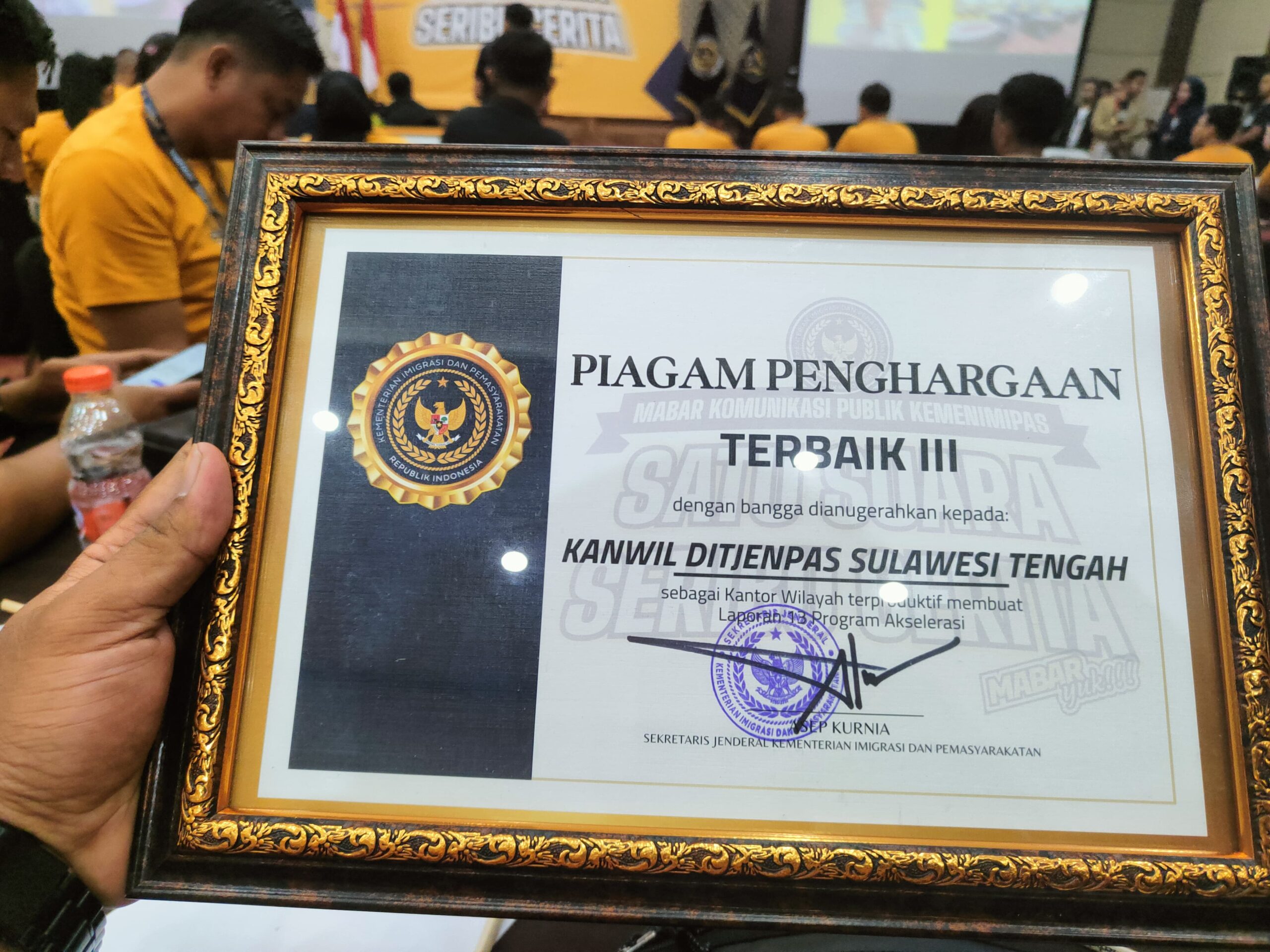 TLii|Sulteng – Bekasi — Kantor Wilayah Direktorat Jenderal Pemasyarakatan (Kanwil Ditjenpas) Sulawesi Tengah kembali mencatatkan prestasi di tingkat nasional. Dalam ajang MABAR (Maju Bareng) Komunikasi Publik Kemenimipas 2025, Kanwil Ditjenpas Sulteng berhasil meraih Penghargaan Terbaik III untuk kategori Kanwil Terproduktif dalam pelaporan 13 Akselerasi Menteri Imigrasi dan Pemasyarakatan.
