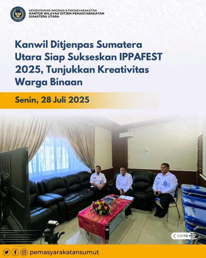 TIMELINES INEWS INVESTIGASI, Medan Kanwil Direktorat Jenderal Pemasyarakatan Sumatera Utara siap menyukseskan Indonesian Prison Products and Arts Festival (IPPAFEST) 2025 yang akan digelar sebagai bagian dari rangkaian peringatan Hari Ulang Tahun Kemerdekaan Republik Indonesia ke-80. Kegiatan koordinasi persiapan IPPAFEST ini diikuti secara daring oleh Kepala Kanwil Ditjenpas Sumatera Utara, Yudi Suseno, didampingi Kabid Pelayanan dan Pembinaan, Hamdi Hasibuan serta Ketua Tim Pembinaan, Josua Ginting, dari ruang kerja Kepala Kantor Wilayah pada Senin, 28 Juli 2025.