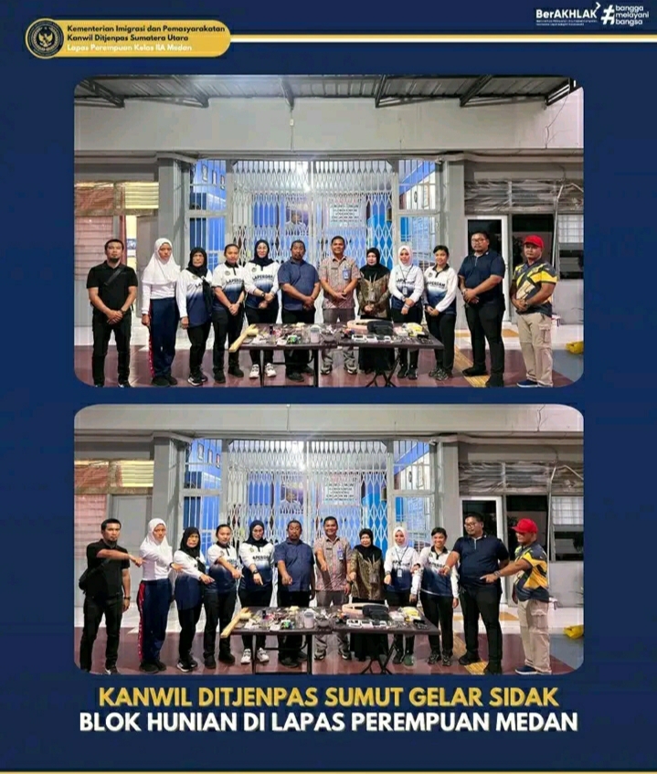 TIMELINES INEWS INVESTIGASI, Medan, 25 Juli 2025 Kantor Wilayah Direktorat Jenderal Pemasyarakatan (Kanwil Ditjenpas) Sumatera Utara melaksanakan inspeksi mendadak (sidak) ke blok hunian di Lapas Perempuan Kelas IIA Medan pada hari ini. Kegiatan ini bertujuan memastikan keamanan, disiplin, dan kepatuhan terhadap prosedur di lingkungan hunian warga binaan.