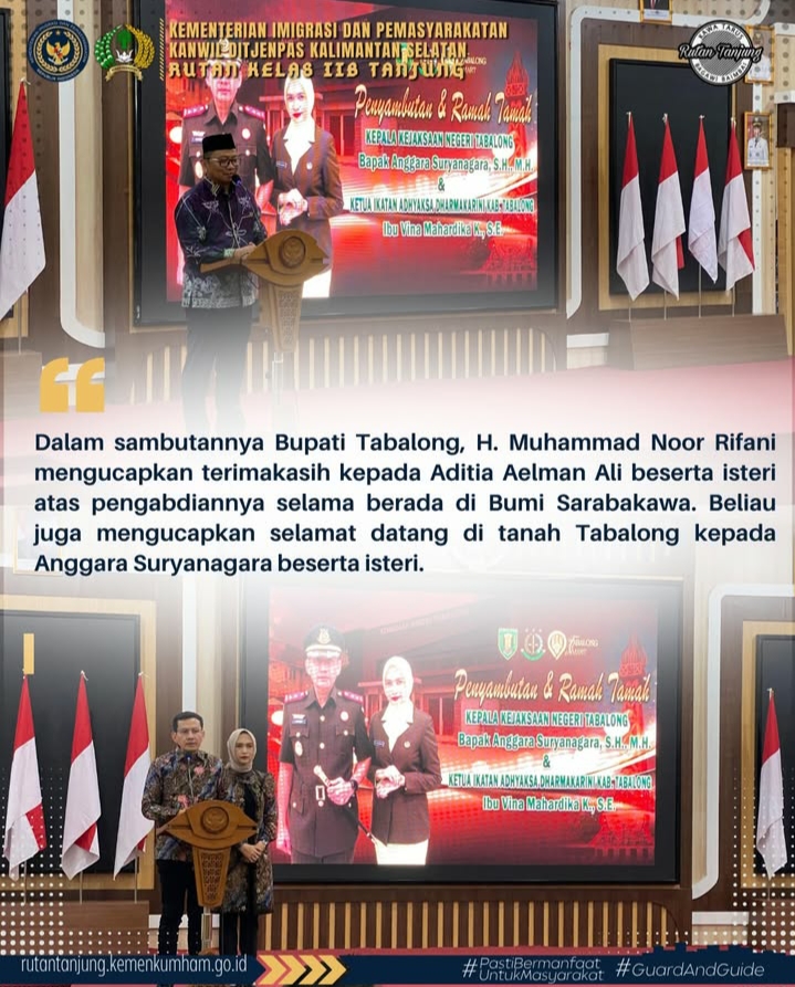 TIMELINES INEWS INVESTIGASI, Tabalong, 30 Juli 2025 Kepala Rumah Tahanan Negara (Rutan) Kelas IIB Tanjung, Raymon Andika Girsang, menghadiri acara Penyambutan dan Ramah Tamah Kepala Kejaksaan Negeri Tabalong yang baru, Bapak Anggara Suryanagara, S.H., M.H., beserta Ketua Ikatan Adhyaksa Dharmakarini Kabupaten Tabalong, Ibu Vina Mahardika K., S.E. Kegiatan ini dilaksanakan di Balai Rakyat Dandung Suchrowardi, Kabupaten Tabalong, pada Rabu malam (30/07/2025).