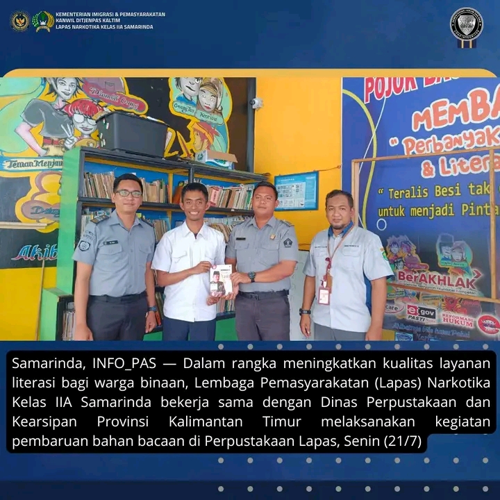 TIMELINES INEWS INVESTIGASI, Samarinda, 21 Juli 2025 Dalam upaya mendukung peningkatan kualitas layanan literasi di lingkungan pemasyarakatan, Lembaga Pemasyarakatan (Lapas) Narkotika Kelas IIA Samarinda menjalin kerja sama dengan Dinas Perpustakaan dan Kearsipan Provinsi Kalimantan Timur. Kolaborasi ini diwujudkan melalui kegiatan pembaruan koleksi bahan bacaan di Perpustakaan Lapas, yang dilaksanakan pada Senin (21/7).