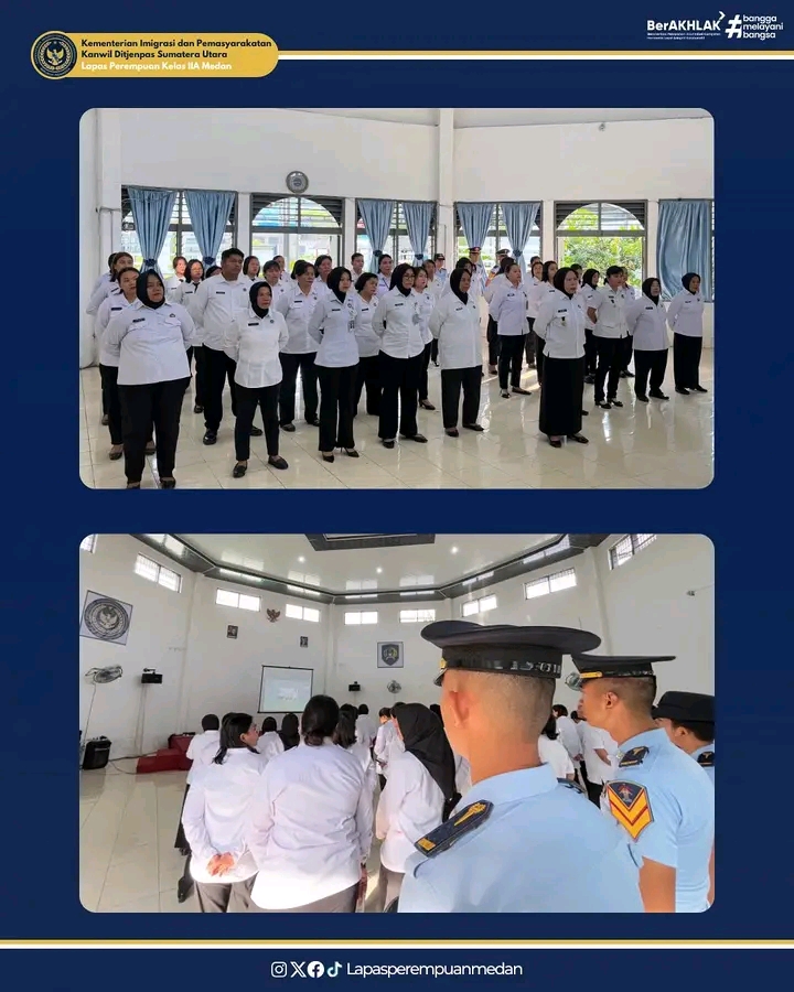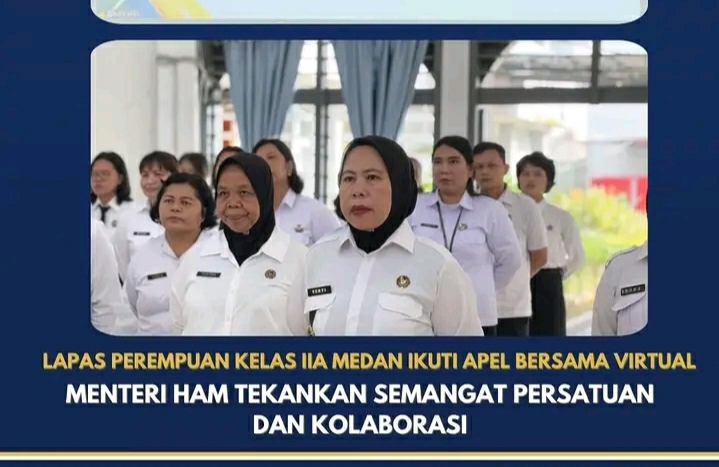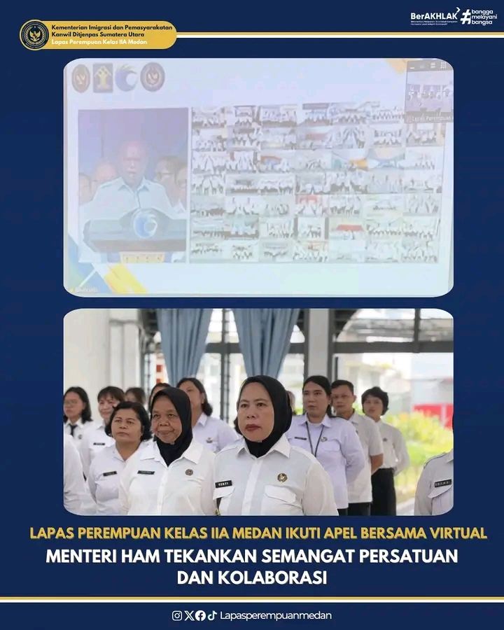 TIMELINES INEWS INVESTIGASI, Medan Sebagai bentuk upaya memperkuat sinergitas antara kementerian serta upaya peningkatan kualitas pelayanan publik, Lapas Perempuan Kelas IIA Medan mengikuti kegiatan apel bersama yang digelar secara virtual dari Lapangan Upacara Kementerian Hukum RI di Aula Kantor Lapas Perempuan Kelas IIA Medan yang dipimpin langsung oleh Menteri Hak Asasi Manusia (HAM) Natalius Pigai serta diikuti oleh seluruh jajaran Kantor Wilayah dan Unit Pelaksana Teknis di lingkungan Kementerian Koordinator Bidang Hukum, HAM, Imigrasi dan Pemasyarakatan. Senin, (14/07)