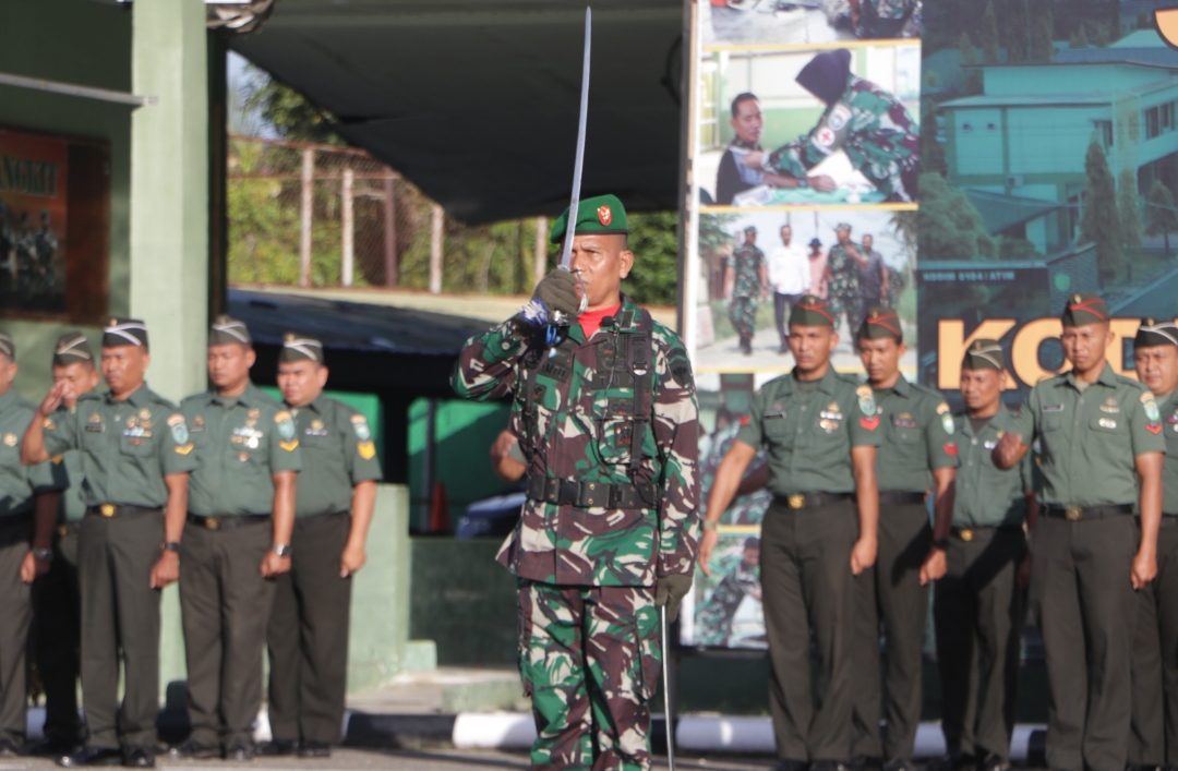 Dandim 0104/Atim pimpin upacara sekaligus menyapa prajurit, mantapkan semangat untuk Indonesia. (Foto : Humas Kodim 0104/Atim)
