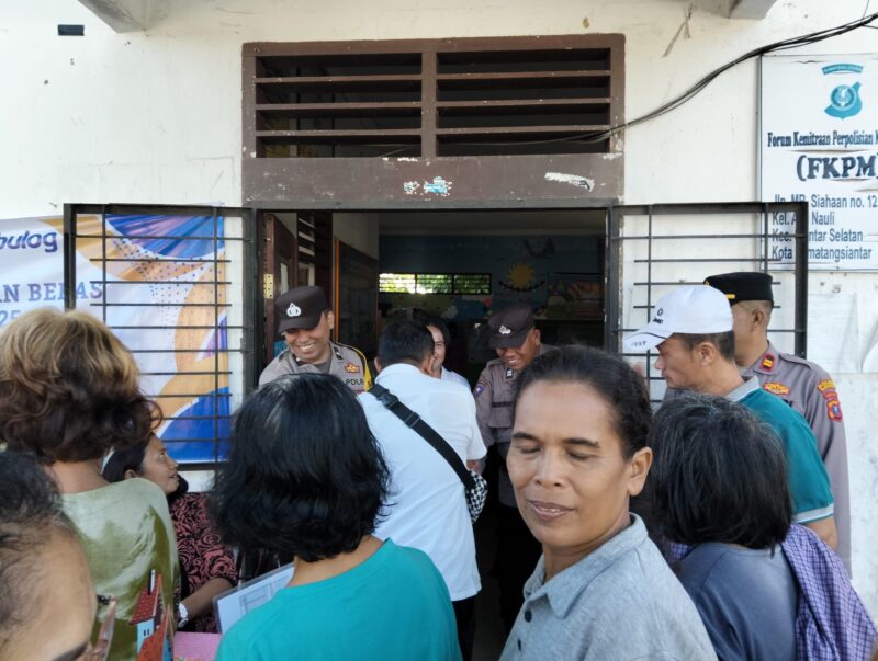 TLii|SUMUT|SIANTAR|Kepala Kepolisian Sektor (Kapolseķ) Siantar Selatan IPTU Priston Simbolon didampingi PS. Kanit Binmas AIPTU Panogaran Manurung dan Bhabinkamtibmas Kelurahan Aek Nauli Aipda Hery Tarigan melaksanakan monitoring Pembagian Bantuan Pangan Beras Tahun 2025 di Kelurahan Aek Nauli Kecamatan Siantar Selatan, Kota Pematangsiantar.