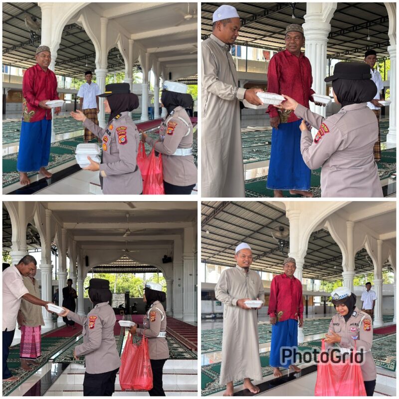 Dipimpin langsung oleh Kasubbag Watpers Bag SDM Polres Pidie Jaya, IPTU Nina Ervianti, S.H., M.H., para Polwan turun langsung membagikan nasi kotak kepada jemaah masjid, warga kurang mampu, dan anak-anak di sekitar lokasi.