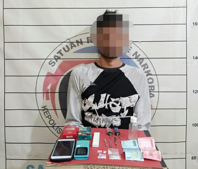 Dalam penggeledahan, polisi menemukan lima paket sabu dengan berat bruto 1,95 gram, yang disembunyikan di kotak pisau karter dan dua bungkus rokok. Barang bukti lainnya yang turut diamankan meliputi dua unit handphone, alat isap sabu (bong), mancis, sendok takar dari pipet plastik, gunting, serta uang tunai Rp150.000 yang diduga hasil transaksi narkoba.